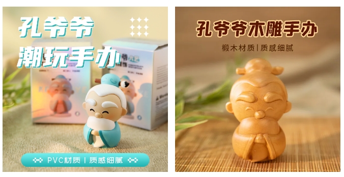 “孔爷爷六艺文韵雅饰盲盒”则以全新创意重塑孔子IP形象:“孔爷爷”——以嘟嘟圆脸、长须青衫颠覆传统认知,打造出兼具Q萌质感与文化温度的治愈系形象。该系列将“孔爷爷”与“礼、乐、射、御、书、数”六艺巧妙融合,以PVC与木雕两种材质精工打造,既是精致潮玩艺术品,亦是儒家精神的现代表达。不论是置于案头装饰,还是作为佳节赠礼,皆能传递文化之美。