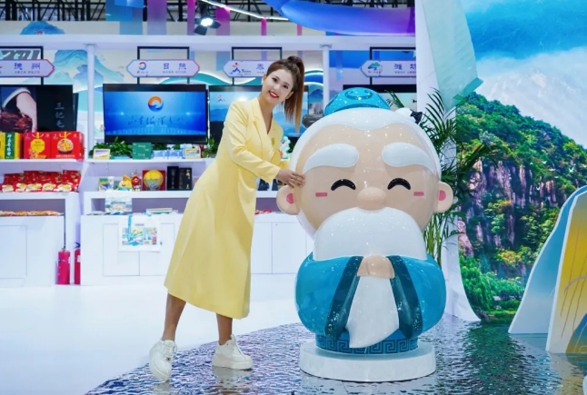 步入山东展区,一座憨态可掬的“孔爷爷”雕塑正以传统拱手礼迎候八方来客。